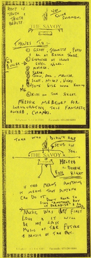 Pulp's His 'n' Hers LP was very nearly the winner of the 1994 Mercury Music Prize, but lost out by one vote to M People's Elegant Slumming. Below are scans of Jarvis' handwritten notes that would have formed the basis of Pulp's acceptance speech had they won.